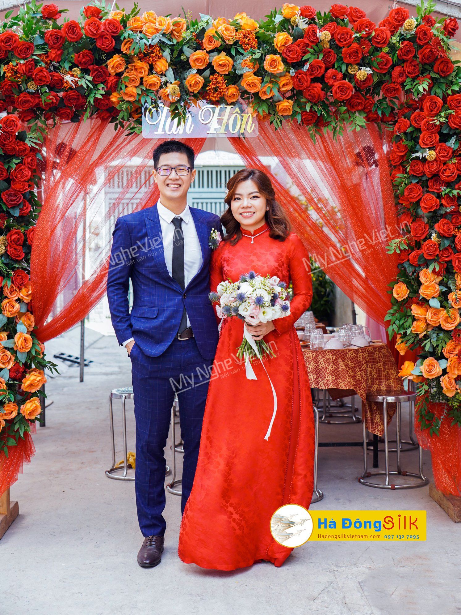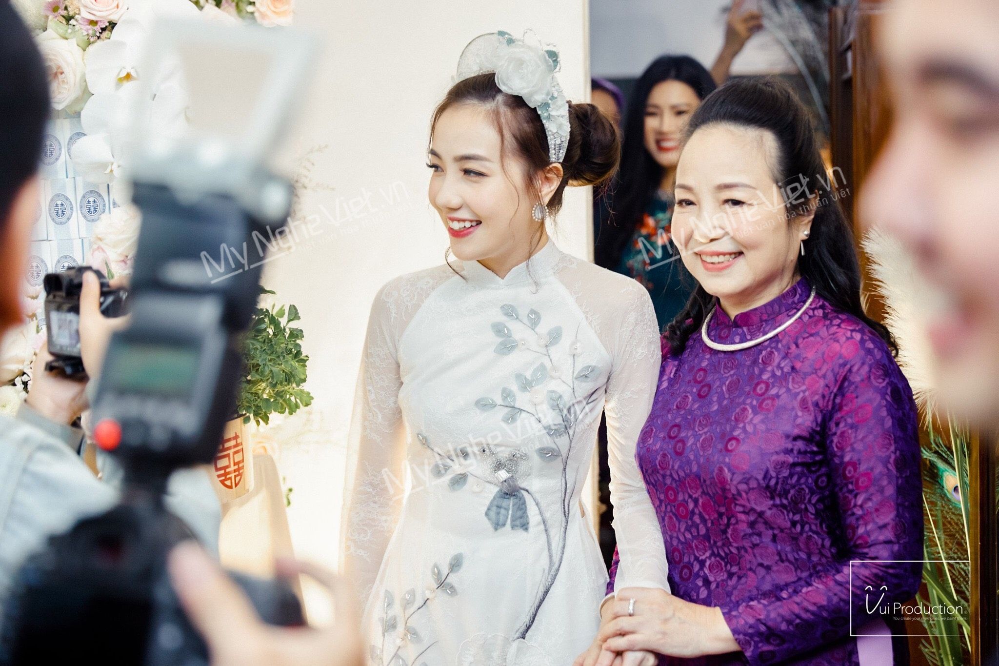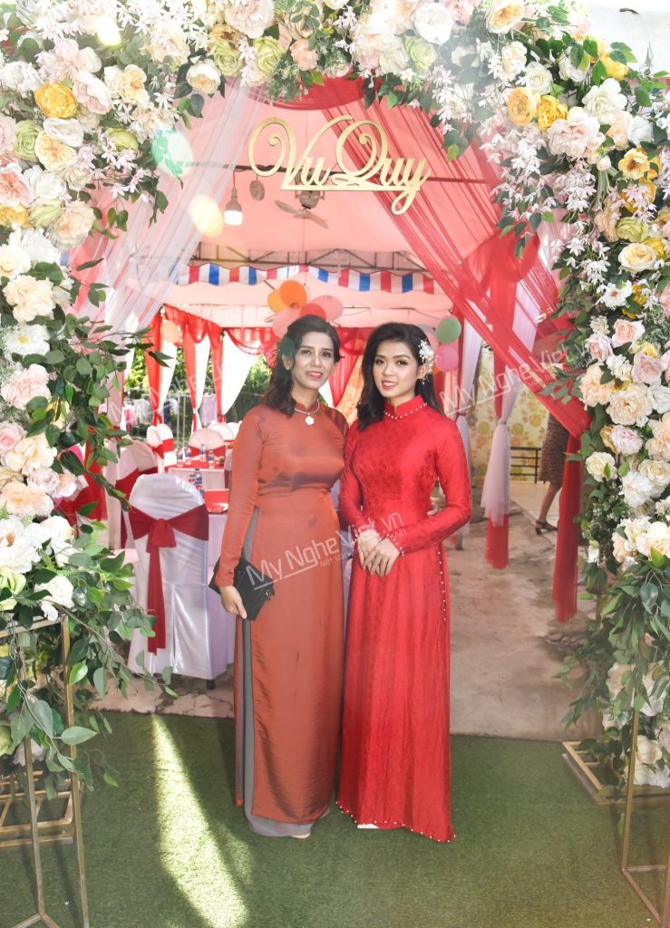 Chiếc áo dài đính hạc hoa tạo thêm điểm nhấn của chiếc áo. Áo dài được điểm thêm các bông hoa và cành cây nhỏ từ ngược xuống vòng eo và xuống tà áo, góp phần tạo điểm nhấm độc đáo của chiếc áo dài và làm tôn thêm vòng vòng eo của người phụ nữ. Bên cạnh đó, áo dài được mặc kết hợp với mấn đọc đáo giúp cô dâu thêm nổi bật.